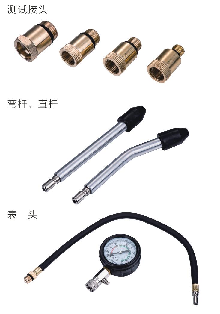 ● 2.5寸专业级双刻度表头, 读数范围0-300psi,0-2000kpa 。 ● M10*1,M12*1.25,M14*1.25,M18*1.5通用接头,增配锥型橡胶接头2只。 ● 表组减压阀设计,方便实用。