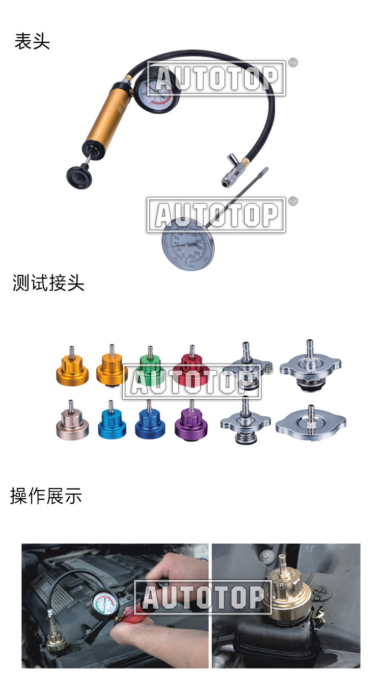 ● 测试车辆冷却系统泄漏; ● 含泵体,测试头; ● 适用于车型见英文部分:
